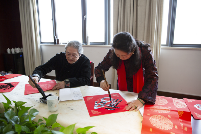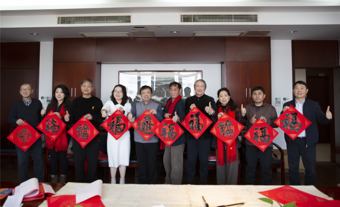 在送春联环节,北京当代艺术研究院秘书长胡维钢,南京市书法家协会副秘书长黄征,江苏华夏艺术研究院副院长孙忠尧,中国书法家协会高级教师、南京书法家协会理事朱权,中国书法家协会高级教师邱骥、叶峰,南京江北新区青年书法家协会理事许馨文等书画家挥毫泼墨,为省社科联60余名工作人员送春联、写福字,通过笔墨传达美好的新年愿景。
