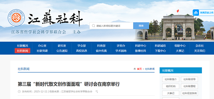 2025年12月9日至10日,由省散文学会主办的第三届“新时代散文创作面面观”研讨会在南京举行。省社科联副主席张新科,中国作家出版社社长鲍坚,人民日报海外版副总编辑、中国散文学会副会长李舫等出席会议并致辞。省散文学会副会长吴向杰主持会议。