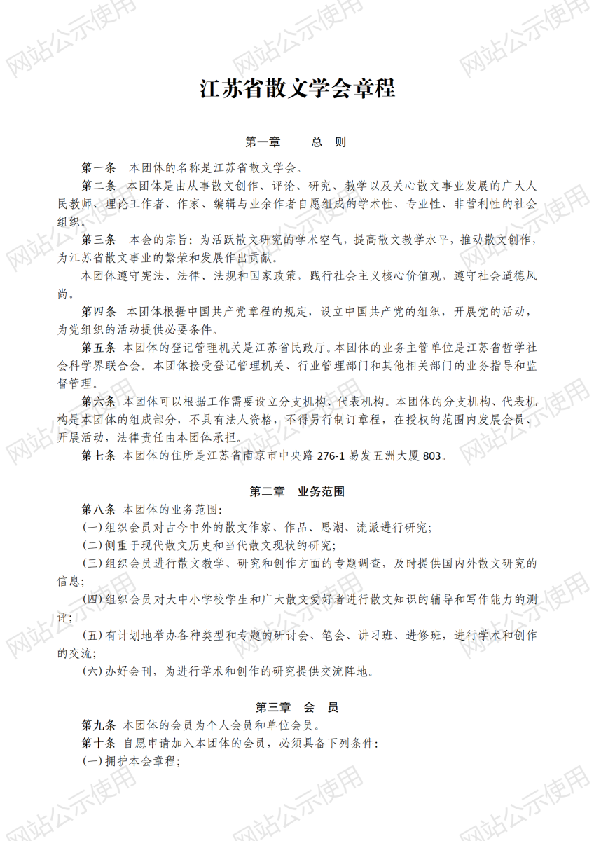 本会的宗旨:为活跃散文研究的学术空气,提高散文教学水平,推动散文创作,为江苏省散文事业的繁荣和发展作出贡献。本团体遵守宪法、法律、法规和国家政策,践行社会主义核心价值观,遵守社会道德风尚。 本会业务范围: (一)组织会员对古今中外的散文作家、作品、思潮、流派进行研究; (二)侧重于现代散文历史和当代散文现状的研究; (三)组织会员进行散文教学、研究和创作方面的专题调查,及时提供国内外散文研究的信息; (四)组织会员对大中小学校学生和广大散文爱好者进行散文知识的辅导和写作能力的测评; (五)有计划地举办各种类型和专题的研讨会、笔会、讲习班、进修班,进行学术和创作的交流; (六)办好会刊,为进行学术和创作的研究提供交流阵