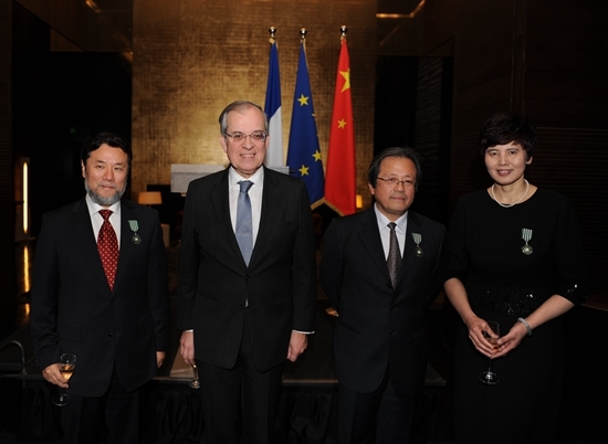法国驻华大使顾山(左二)代表法国政府授予冯远(右二)、陈维亚(左一)、徐坚(右一)法国文化艺术骑士勋章
