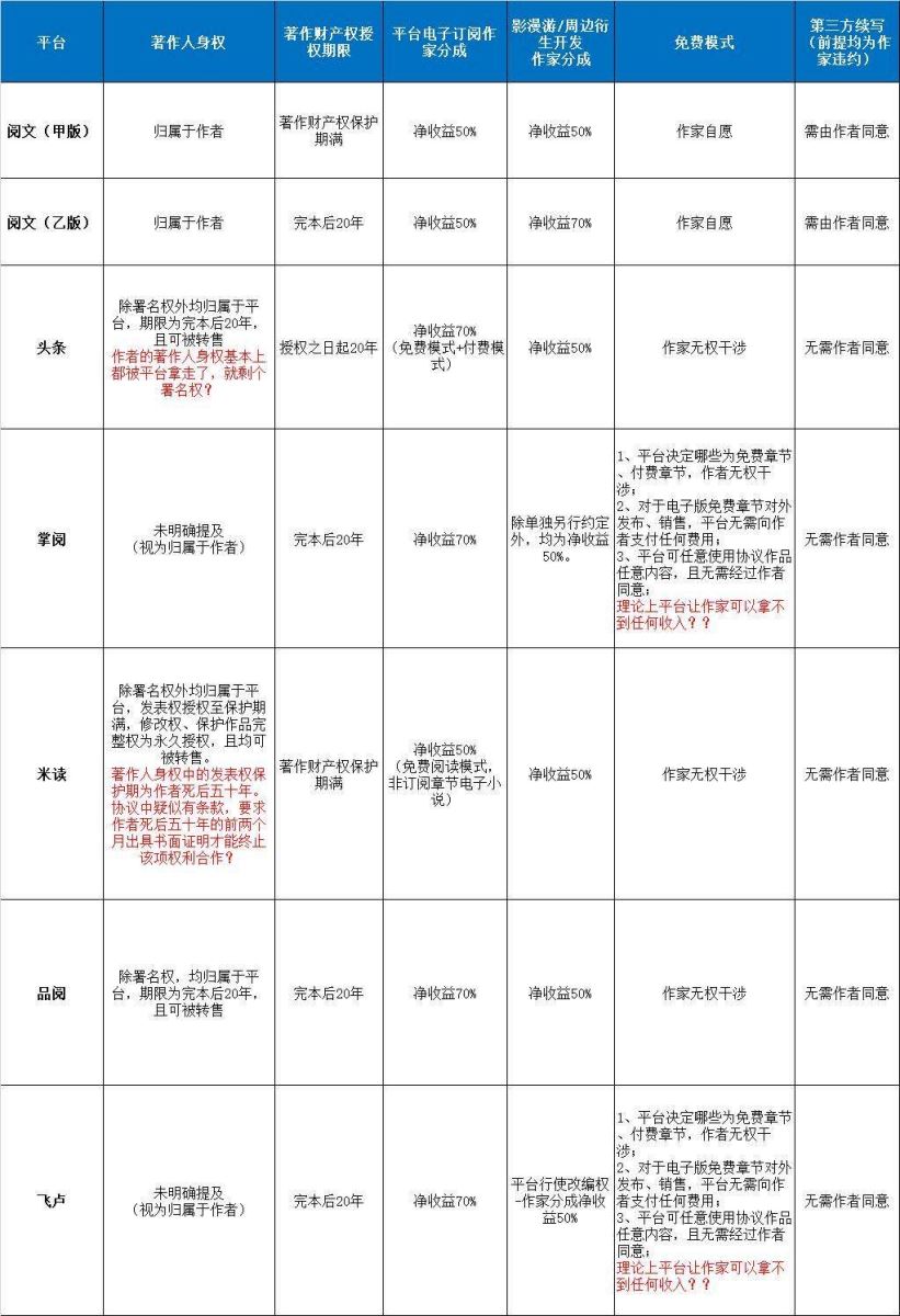 中国作家网记者梳理后发现,基础协议对作者而言意味着无推荐、无订阅、无收入;而深度协议更多面向的是已成名的作家;所以,焦点主要体现在甲乙两版的授权协议上。