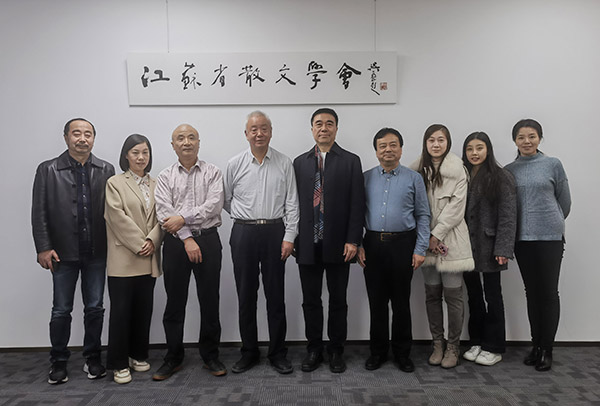 11月27日下午,《江南时报》社社长管云林一行深入江苏省散文学会进行调研,江苏省作家协会一级巡视员王朔、省散文学会会长姜琍敏、执行会长蒯天、副会长兼秘书长吴向杰、省电力作家协会副主席许静以及学会理事束向红等人参加座谈。