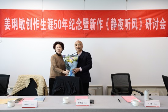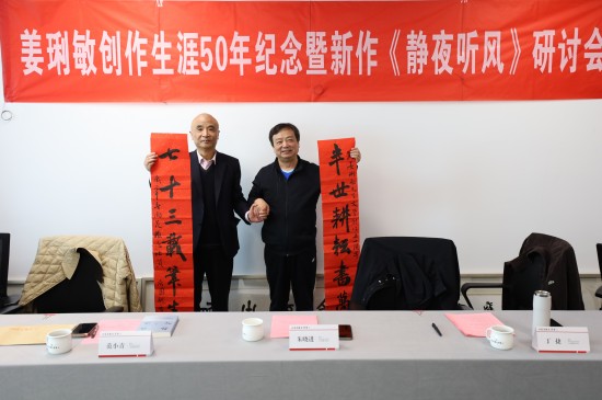 在热烈的氛围中,丁捷向姜琍敏赠送了他的绘画作品、范小青代表省作协向姜琍敏赠送鲜花,王剑冰代表中国散文学会向姜琍敏赠送了他的书法作品,蒯天代表《雨花》杂志社向姜琍敏赠送了“半世耕耘书万卷,七十三载笔生辉”贺联;大家以此致敬姜琍敏半个世纪的辛勤笔耕,并祝福他艺术之树常青。姜琍敏则感慨万千,深情回顾了创作生涯的酸甜苦辣,并对各方长期以来的支持与厚爱表示衷心感谢。